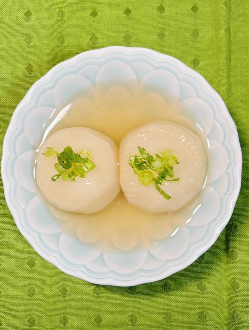 レシピ提供者:髙濱さん 【旬を楽しむ”かぶ”➁】 材料 4人分 かぶ 4個 だし汁 600ml かぶの茎・葉 適量 淡口しょうゆ 大さじ2 片栗粉 大さじ…